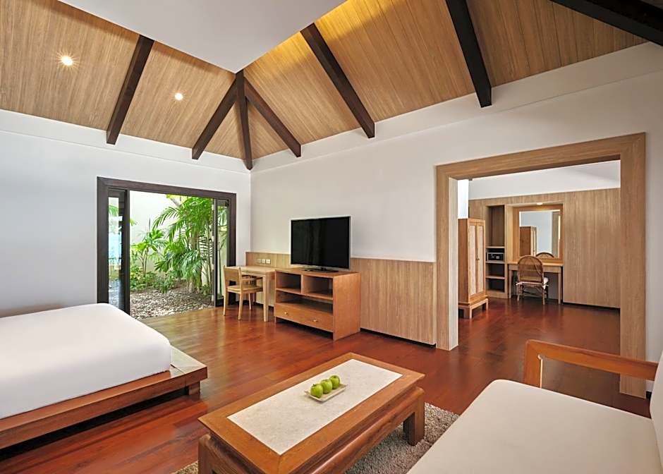 A Seaview Villa with a king size bed and a private pool, located on the 2nd row. Two adjacent villas can be linked for larger families or friends traveling together.